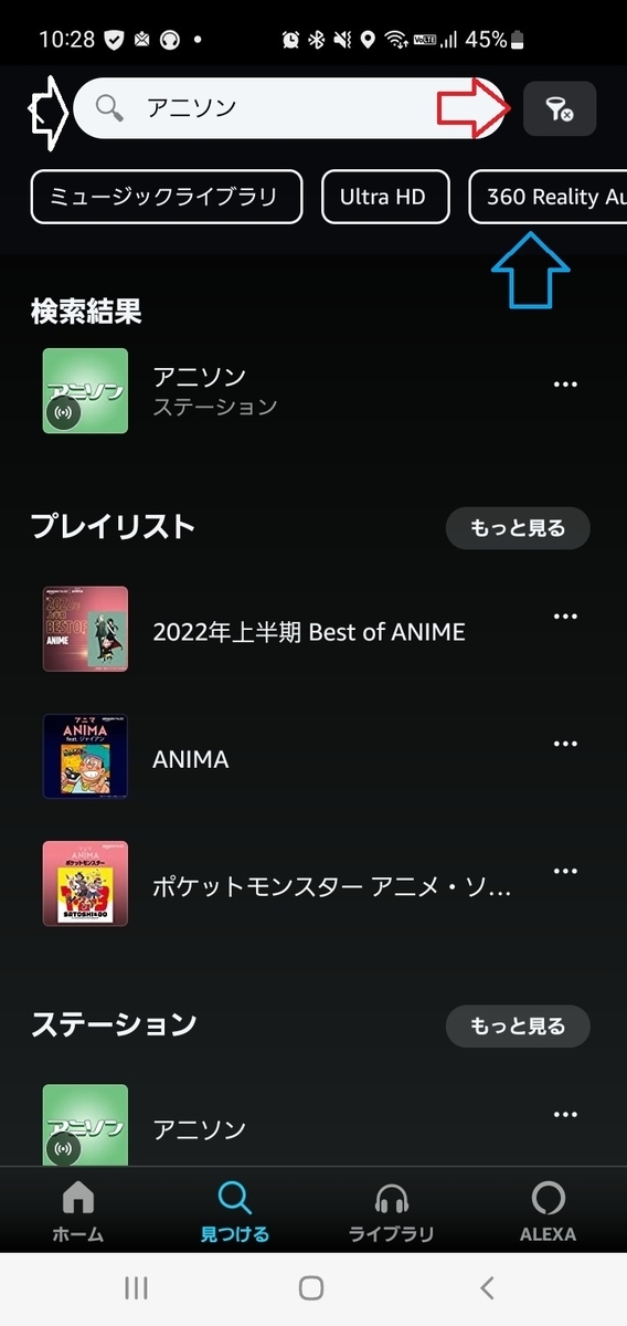 Deezerアプリに比べて、対応楽曲の検索がしやすいです。Deezerアプリはアーティスト一覧が表示されて選択することしかできませんでしたが、Amazon musicは検索語に絞り込みをすることで360 Reality Audio対応楽曲を見ることが出来ます。