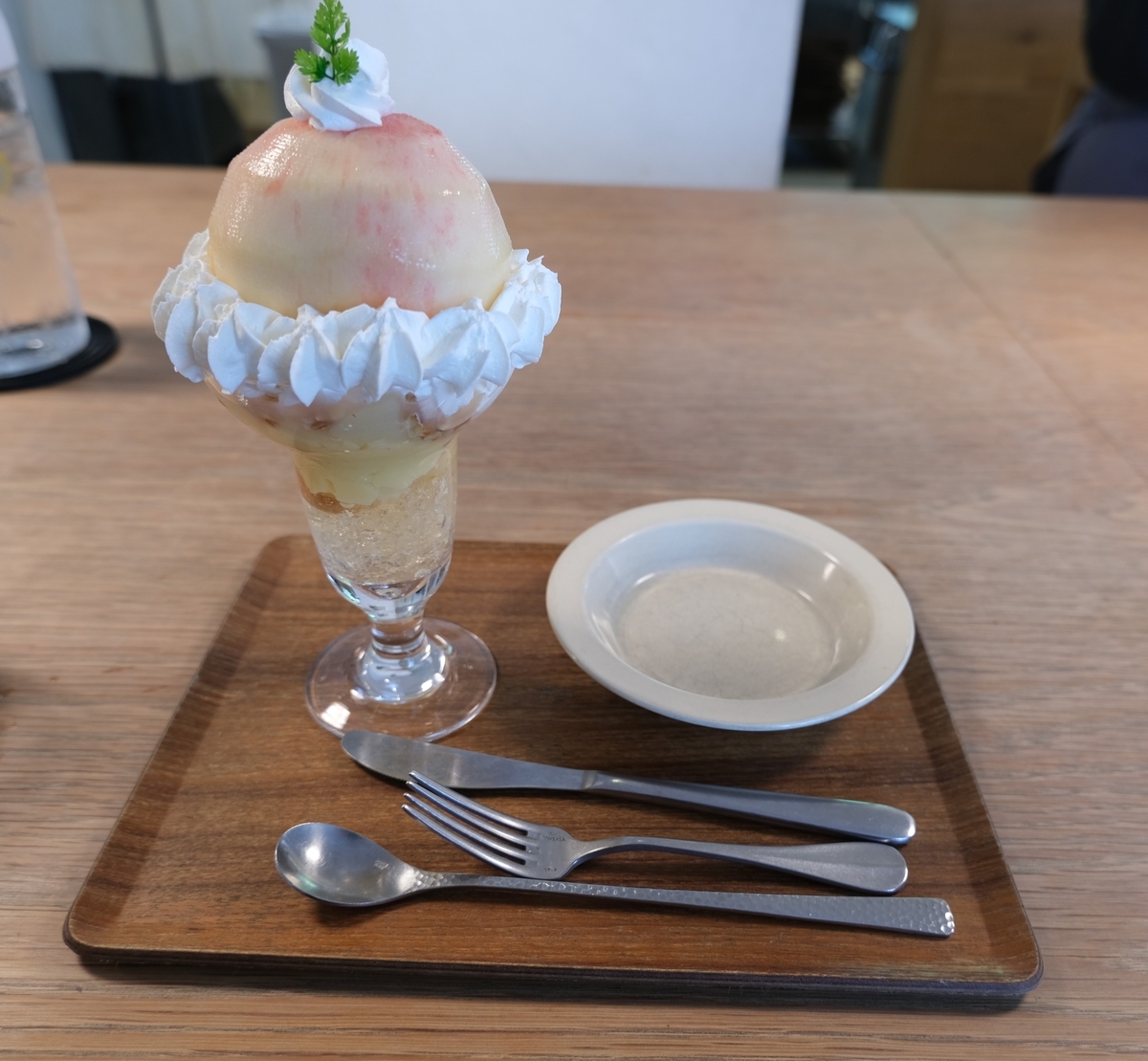 丸のままの桃を割った時にゼリーが出てきてビックリ!見た目も味も楽しめる素晴らしいパフェでした。
